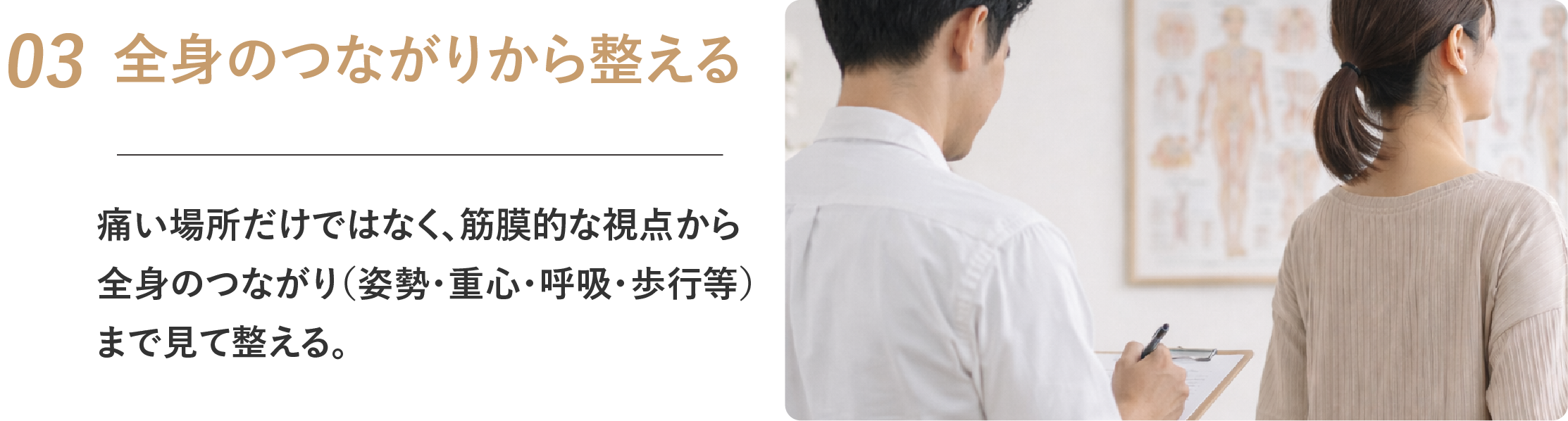 痛い場所だけではなく、筋膜的な視点から全身のつながり(姿勢・重心・呼吸・歩行等)まで見て整える。